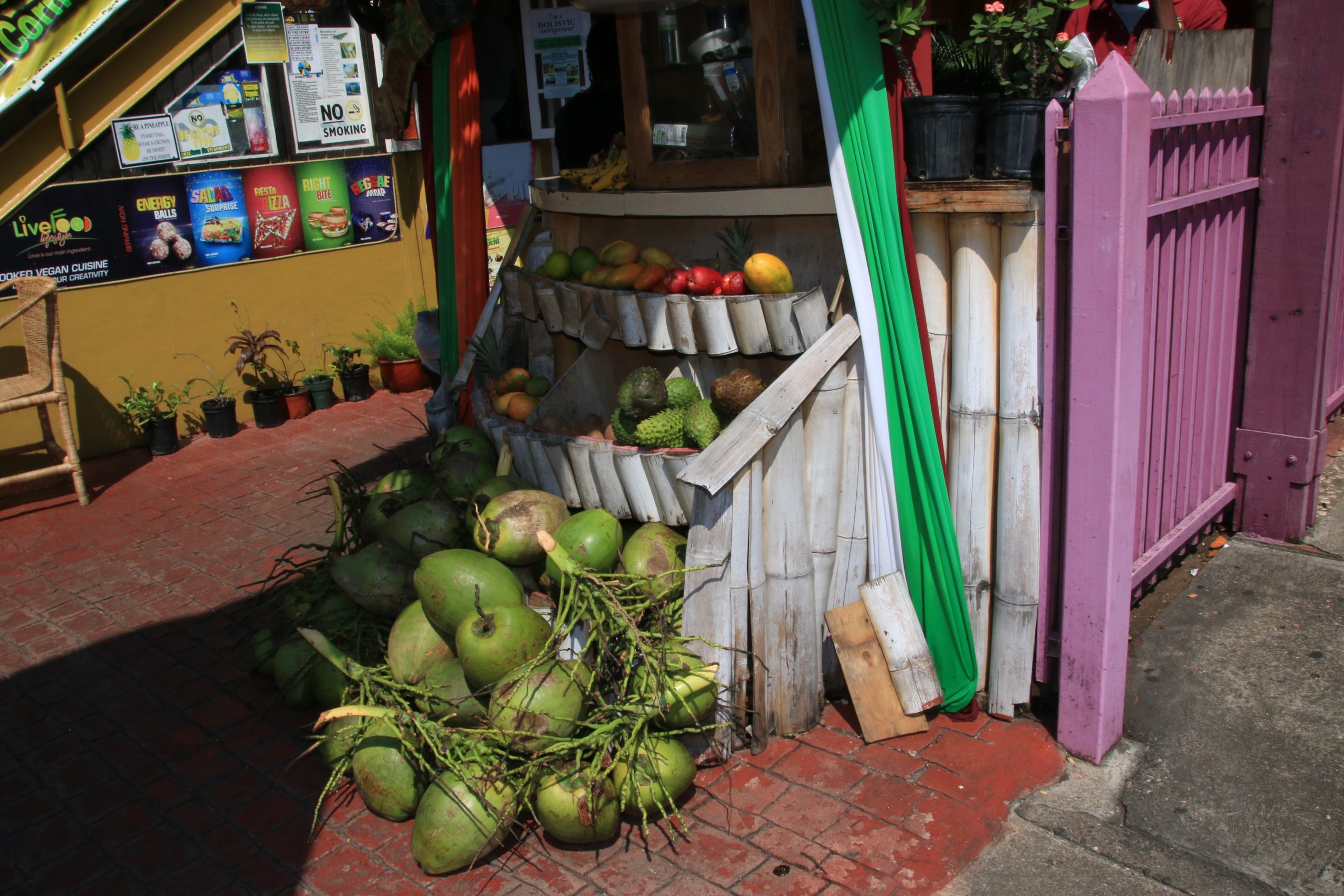 Weiter geht unsere Fahrt nach Kingston. Die Luftfeuchtigkeit ist sehr hoch; die Regenfälle der vergangenen Tage haben Spuren hinterlassen, die Straße ist teilweise weggespült. Im Zentrum jeder Jamaikanischen Stadt gibt es einen Platz mit einer großen Standuhr, ganz nach altenglischem Vorbild. Hier herrscht geschäftiges Gewusel: Lädchen mit den Dingen für den täglichen Bedarf, Andenkenshops und Jerk-Grillstände, in denen das über Pimentholz gegarte und mit der typischen süß-scharfen Sauce gewürzte Hühnchenfleisch angeboten wird. Eine Gruppe von Männern mit langen Rastalocken hat es sich vor einem Haus gemütlich gemacht. Süßer Rauch steigt auf. Ganja. Seit April 2015 dürfen Erwachsene für den Eigenbedarf in privater Umgebung gut 50 Gramm Marihuana besitzen. Aus dem Auto, das neben uns an der Ampel steht, dröhnen Bässe in Discolautstärke, Dancehall. „Wha gwaan?“ ruft einer der Typen rüber. Carey entgegnet träge: „Notten.“ Übersetzt: „What is going on?“ Antwort: „Nothing.“ Eine typische Jamaikanische Unterhaltung. Carey schüttelt den Kopf: „Diese Musik hat doch keine Aussage. Das einzig Wahre: Roots-Reggae.“ Ya man!